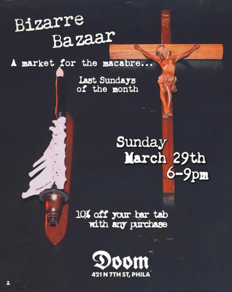 Doom Bar's monthly market for the macabre returns with a fresh lineup of local artists selling original art, jewelry, prints, sculpture, graphic novels, and more. Supporting any artist with a purchase earns 10% off your food and drink tab.