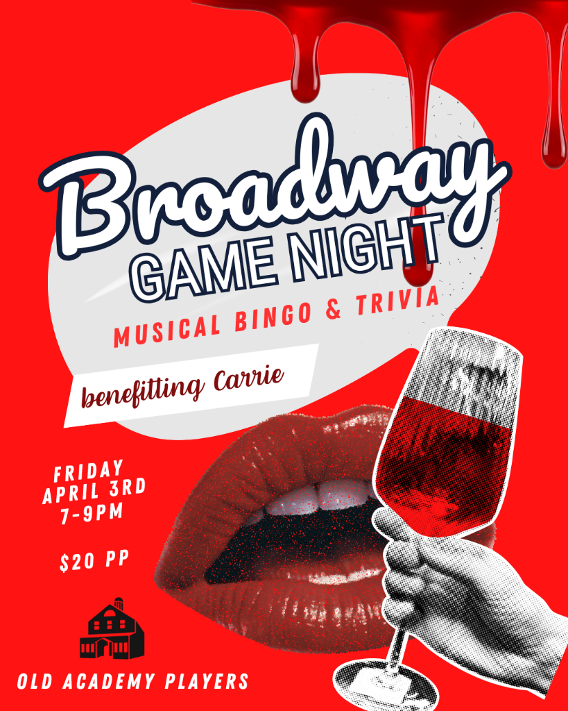 Want to experience “A Night You’ll Never Forget”? Join Old Academy Players for Musical Theater Bingo & Trivia in support of our upcoming production of Carrie: The Musical. Test your Broadway knowledge, enjoy drinks and snacks, and maybe take part in a little mischief along the way. Whether you’re a die-hard musical theater fan or just here to be part of the cool crowd, it’s a night guaranteed to be a scream. Come play, sip, snack, and help us bring this electrifying production to life—no telekinesis allowed! All proceeds will go towards offsetting production costs of Carrie: The Musical