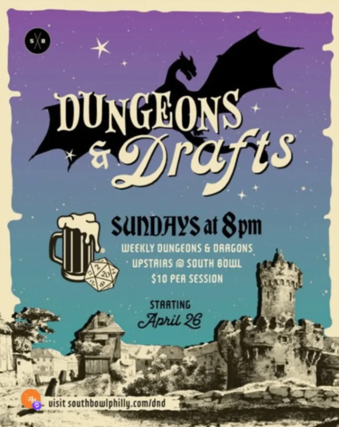 A new weekly Dungeons & Dragons night held in the upstairs loft at South Bowl, launching April 26th. Pull up every Sunday for a casual, community-driven D&D experience with drafts in hand.