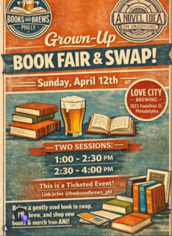 Books and Brews Philly and A Novel Idea on Passyunk team up for a Grown-Up Book Fair and Swap at Love City Brewing. Bring 1–10 gently used books to swap, shop new books, and donate children's books to Tree House Books.