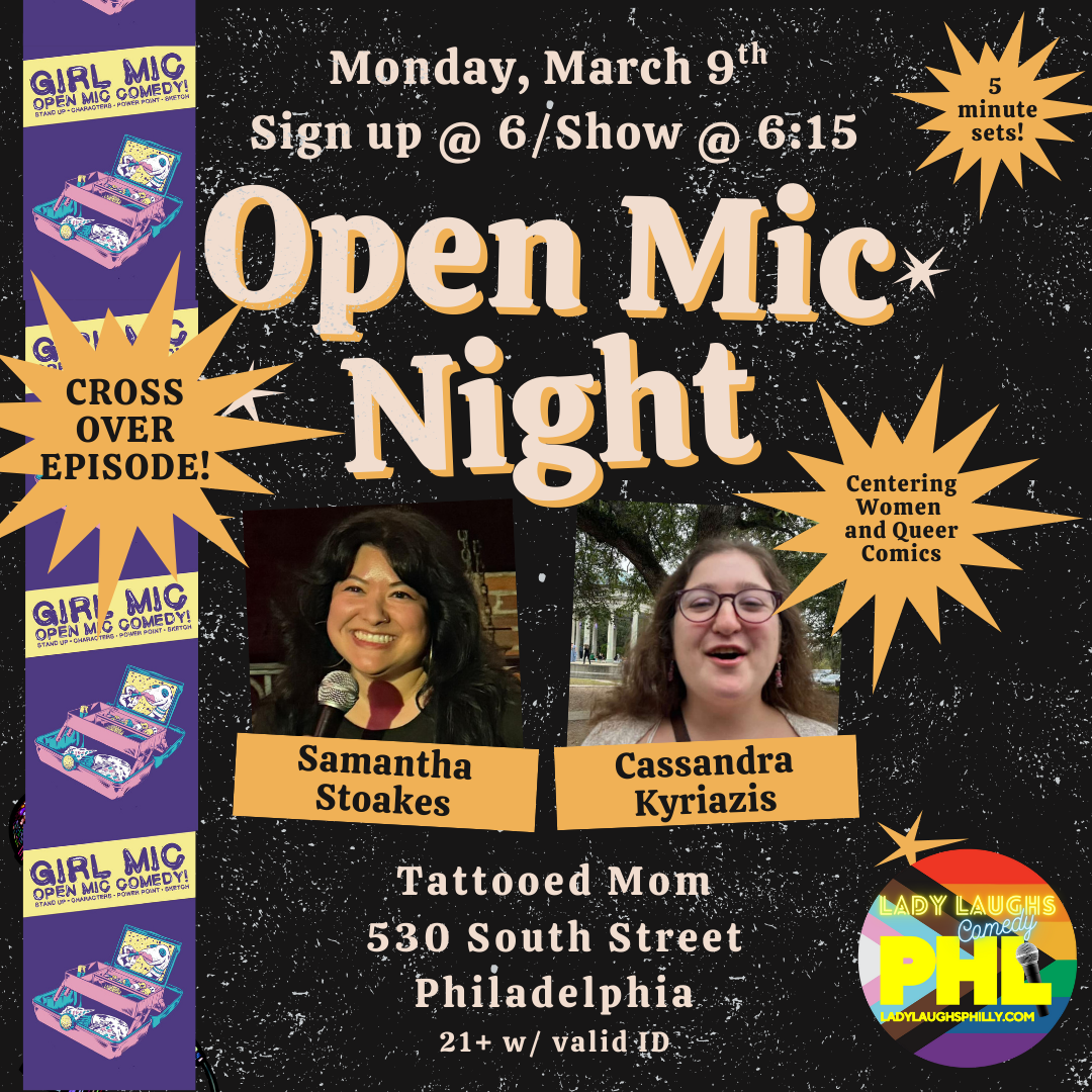 Lady Laughs Philly  is the city’s only monthly comedy show that features all women and queer comics. Our open mic welcomes anyone and everyone, however our open mics center women and queer comics. We hope you’ll join us! MONDAY, MARCH 9TH 6-9PM NO COVER // FREE FUN Hosted by the lovely hosts of  Girl Mic ,  Samantha Stoakes  and  Cassandra Kyriazis . Produced by  Shawna Lutzow Audio/Sound Support by  Kara Ferguson  of  Banter ***