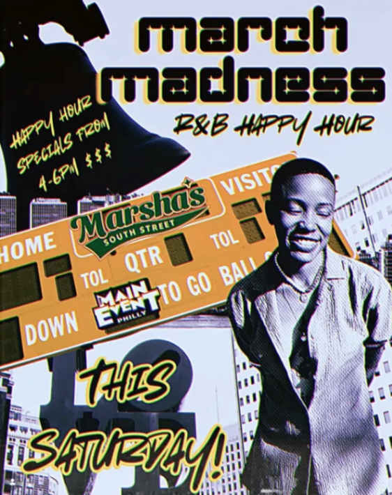 March Madness R&B Happy Hour at Marsha's South Street starts at 4:00 p.m. and ends at 8:00 p.m.