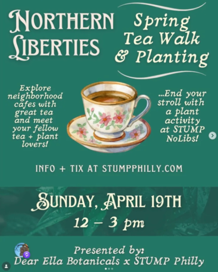 Northern Liberties Spring Tea Walk & Planting at STUMP Northern Liberties starts at 12:00 p.m. and ends at 3:00 p.m.