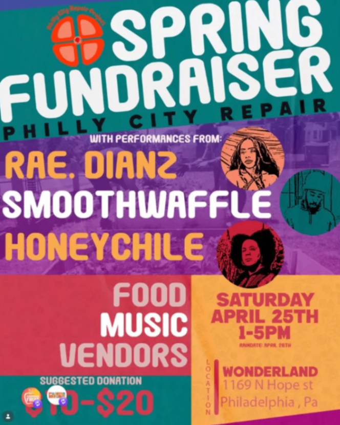 A BYOB spring fundraiser benefiting Philly City Repair Project's network of 20 community gardens and green spaces. Features live performances, food, music, and vendors.