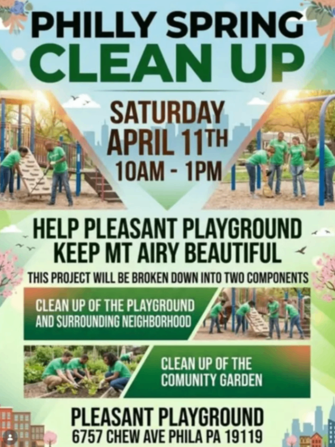 Pleasant Playground hosts its Annual Spring Clean Up in Mt. Airy, focusing on cleaning the playground, surrounding neighborhood, and community garden. This free event is a great opportunity to help keep Mt. Airy beautiful.