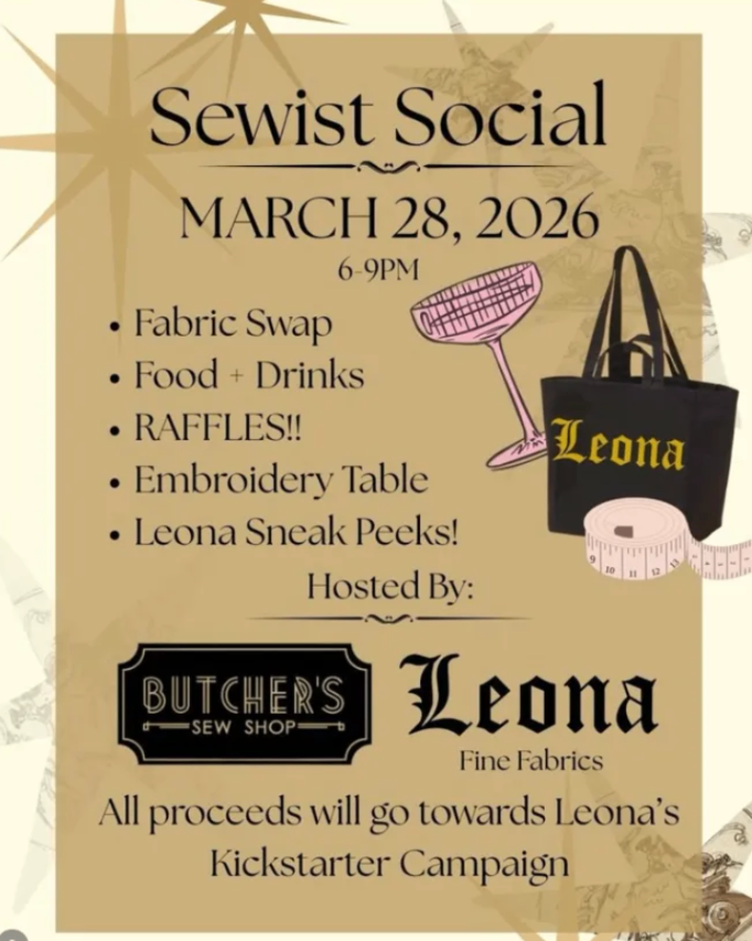 Butcher's Sew Shop and Leona Fine Fabrics co-host a Sewist Social featuring a fabric swap, food and drinks, raffles, an embroidery table, and exclusive sneak peeks of Leona Fine Fabrics. Attendees are encouraged to bring stash fabric to swap and spend a cozy evening with Philadelphia's sewing community.