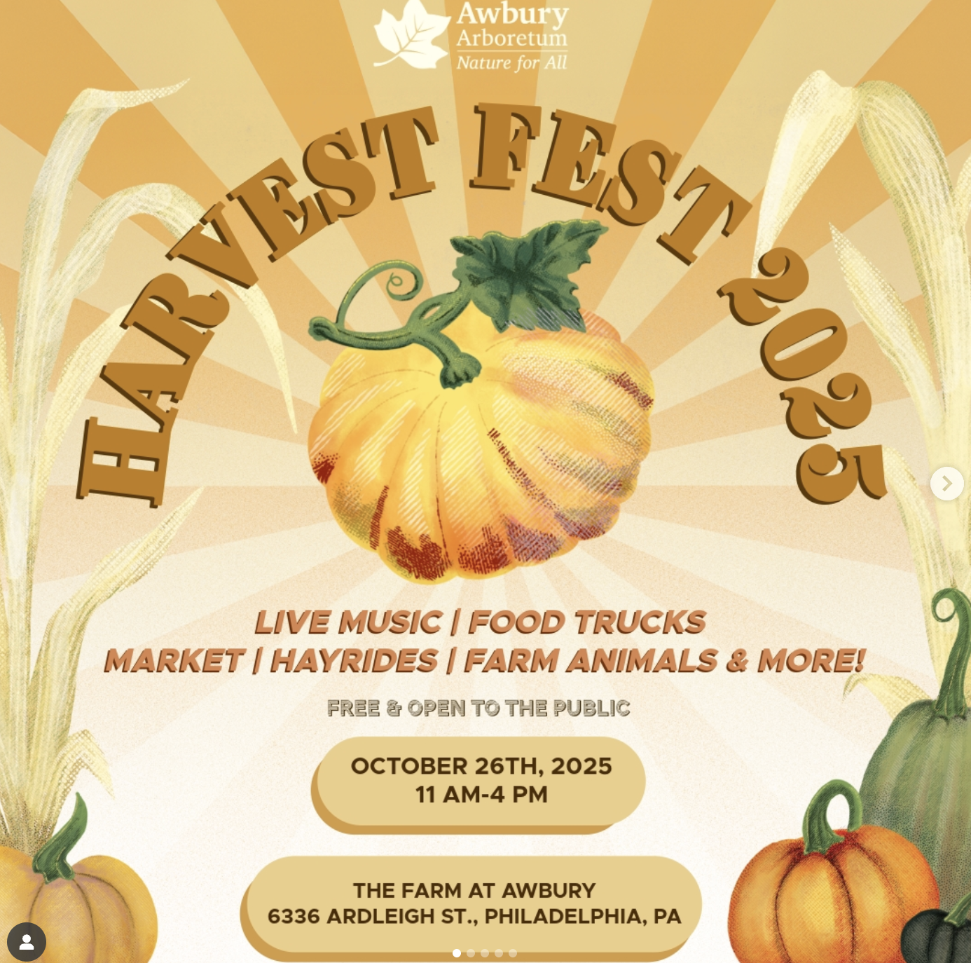 Awbury Arboretum’s signature fall celebration featuring a marketplace of local vendors, food trucks, farm animals, crafts, hayrides, and live music throughout the day. A free, family-friendly gathering on the Farm at Awbury that highlights seasonal fun and community spirit.