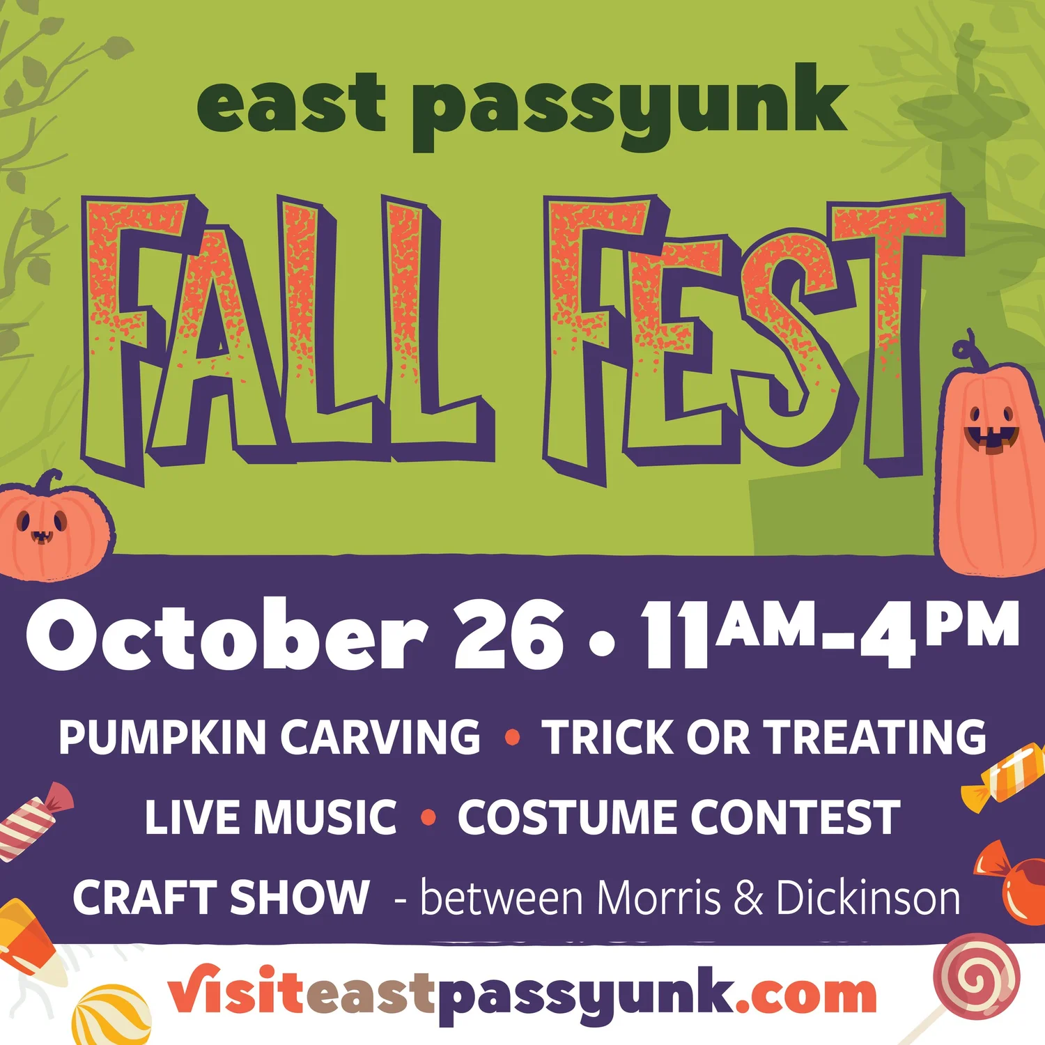 East Passyunk Avenue turns pedestrian-only between Morris and Dickinson for a family day of fall fun. Carve pumpkins, trick-or-treat at participating businesses, and cheer on a neighborhood costume contest while live music sets the tone. Browse vendor specials up and down the Avenue and sample seasonal bites and sips. Free and open to all ages—come costumed and ready to stroll.