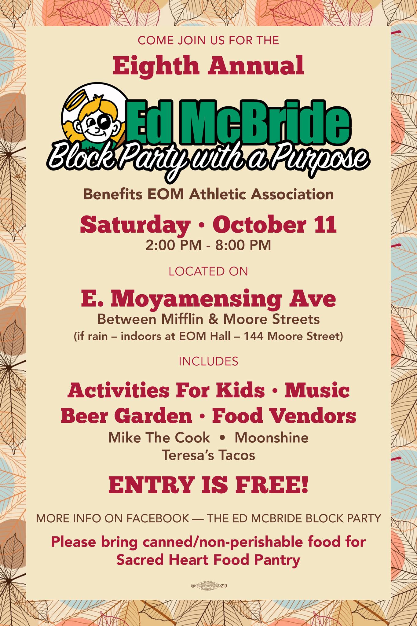 A neighborhood street party on East Moyamensing Ave with kids’ activities, live bands, a beer garden, and local food vendors. Free to attend—guests are encouraged to bring canned goods for the Sacred Heart Food Pantry.