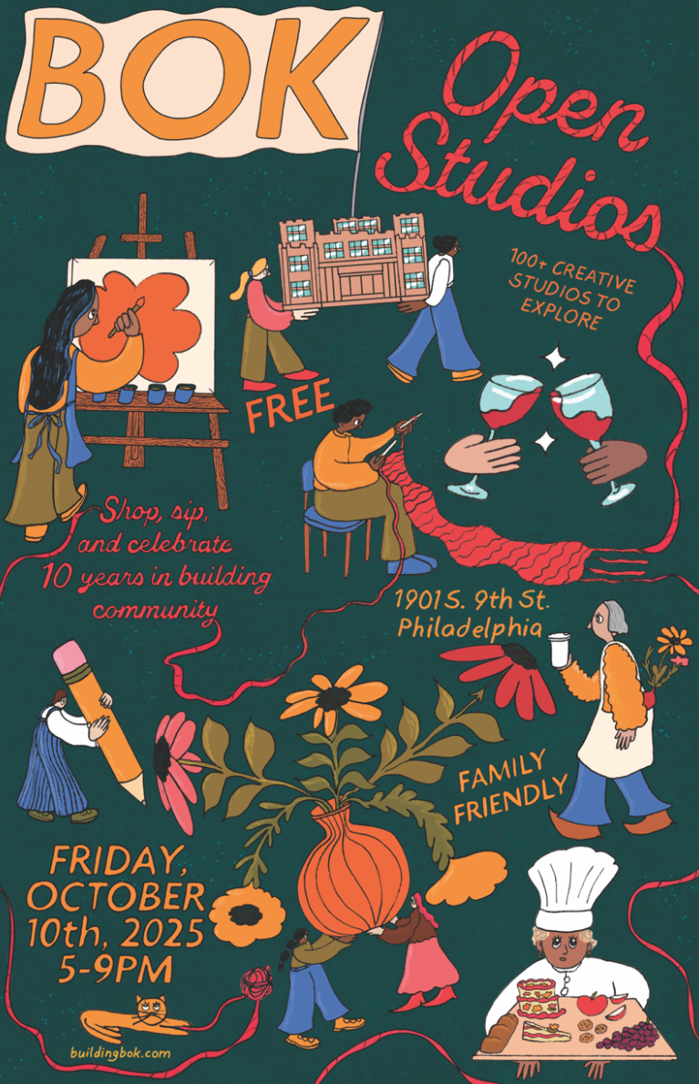 Twice a year, the historic Bok building opens every floor so visitors can wander studios and meet the creative community inside—fine artists, glass blowers, ceramicists, jewelers, guitar makers, designers, photographers, bakers, and more. Expect hallway activations, a vendor presence, and pop-up art and music throughout the building, with easy options to make a night of it at Bok Bar or Irwin’s upstairs.