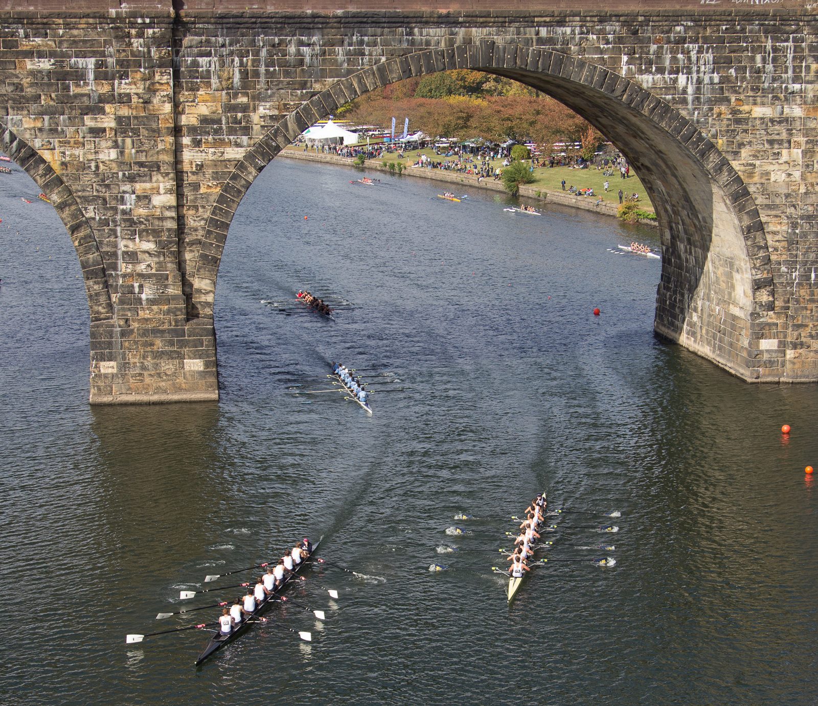 Crew teams from schools and clubs race upstream on the Schuylkill, with viewing areas by Boathouse Row.