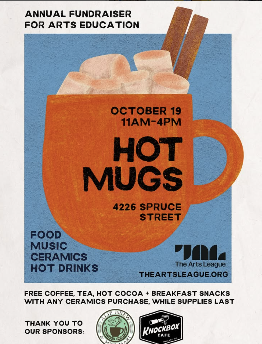 Hot Mugs is The Arts League’s annual ceramics fundraiser in West Philly: pick out a one-of-a-kind handmade mug and enjoy complimentary coffee, tea, and sweet treats. The day typically features artist workshops, open studio activities, and community art projects—sometimes including decorating the organization’s historic porch. Proceeds support The Arts League’s year-round arts education and neighborhood programming.