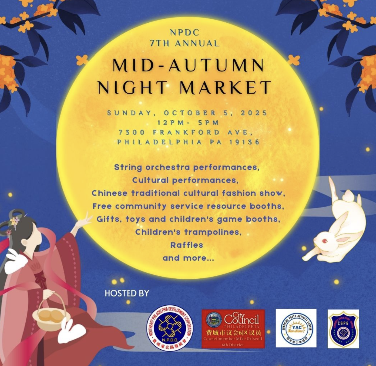 Celebrate the Mid-Autumn Festival with a family-friendly street market at 7300 Frankford Avenue. Enjoy string orchestra performances, a traditional fashion show, and cultural showcases alongside kids’ trampolines, game booths, and raffles. Sample savory bites and sweets from local vendors and connect with neighbors in a lively community setting. Free admission and open to all ages.