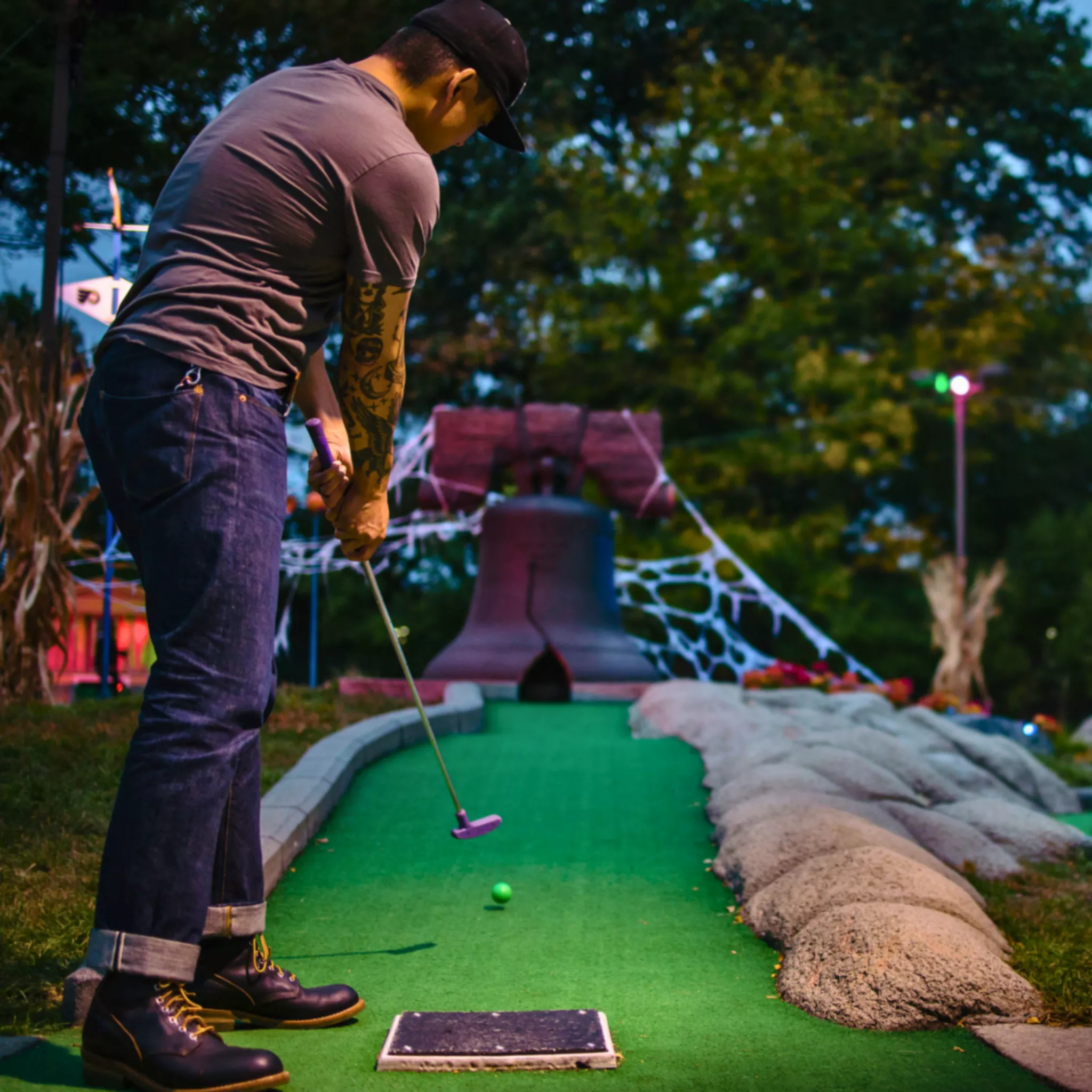 Philly Mini Golf at Franklin Square transforms for spooky season as you putt past Philly landmarks. Choose your vibe: Daytime Tee Time offers a kid-friendly course without effects; Nighttime Tee Time adds animated props, spooky music, reduced lighting, and fog. On select evenings, a Boo-zy Bar serves themed cocktails, brews, wines, and a kid-friendly option. Fridays and Saturdays can sell out; advance tickets recommended. Weeknights and early in the month mean shorter waits.